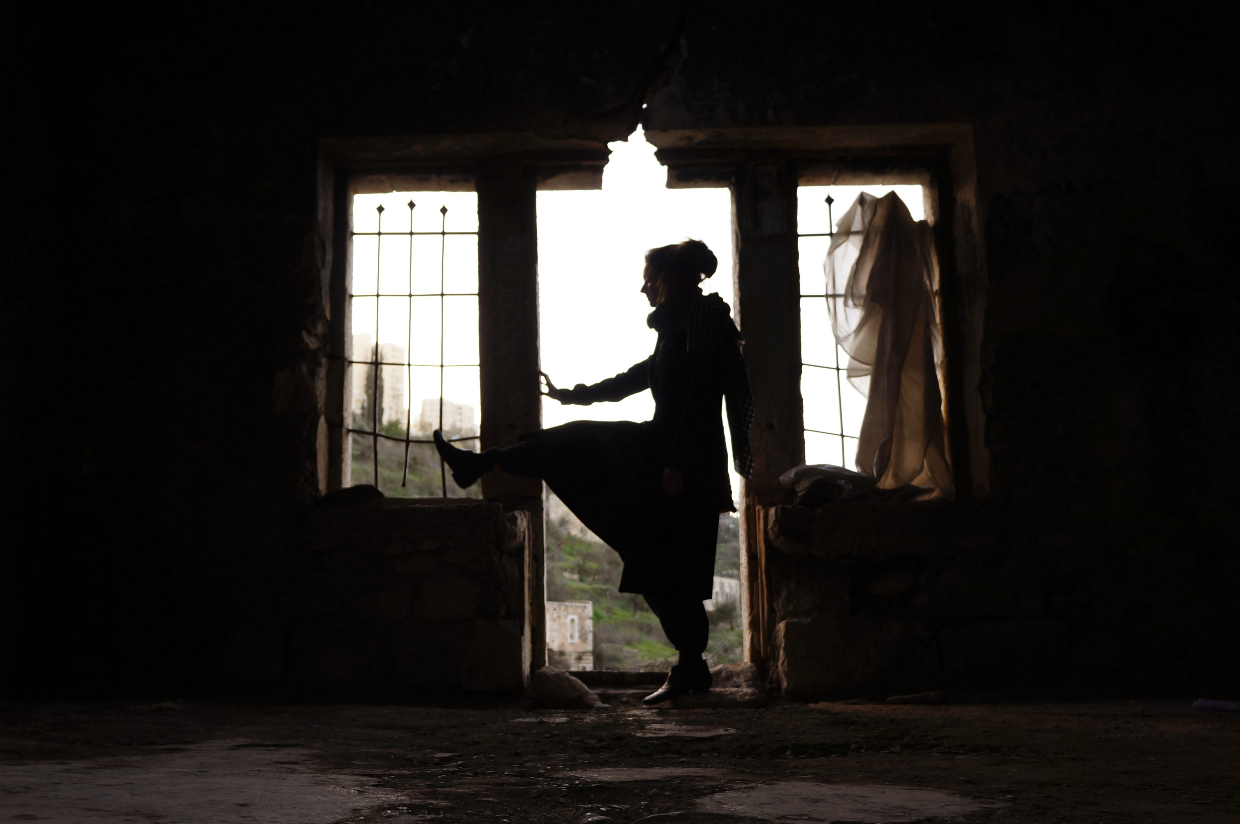 Ich war alleine dort, wollte aber eine Shilouette fotografieren. Eine bessere Pose ist mir nicht eingefallen. Hinter dem Türrahmen fällt gleich steil der Hang ab und an dessen Fuss liegt das Wasserbecken. Als ich dort war, schwammen nackte junge religiöse Männer darin herum. Sie hätten sich sicher nicht gefreut, hätten sie mich gesehen. Etwas weiter links am Hang sass zwischen bröckelnden Steinmauern ein Mann und filmte sie. Vielleicht – hoffentlich – fotografierte er auch einfach das Tal.