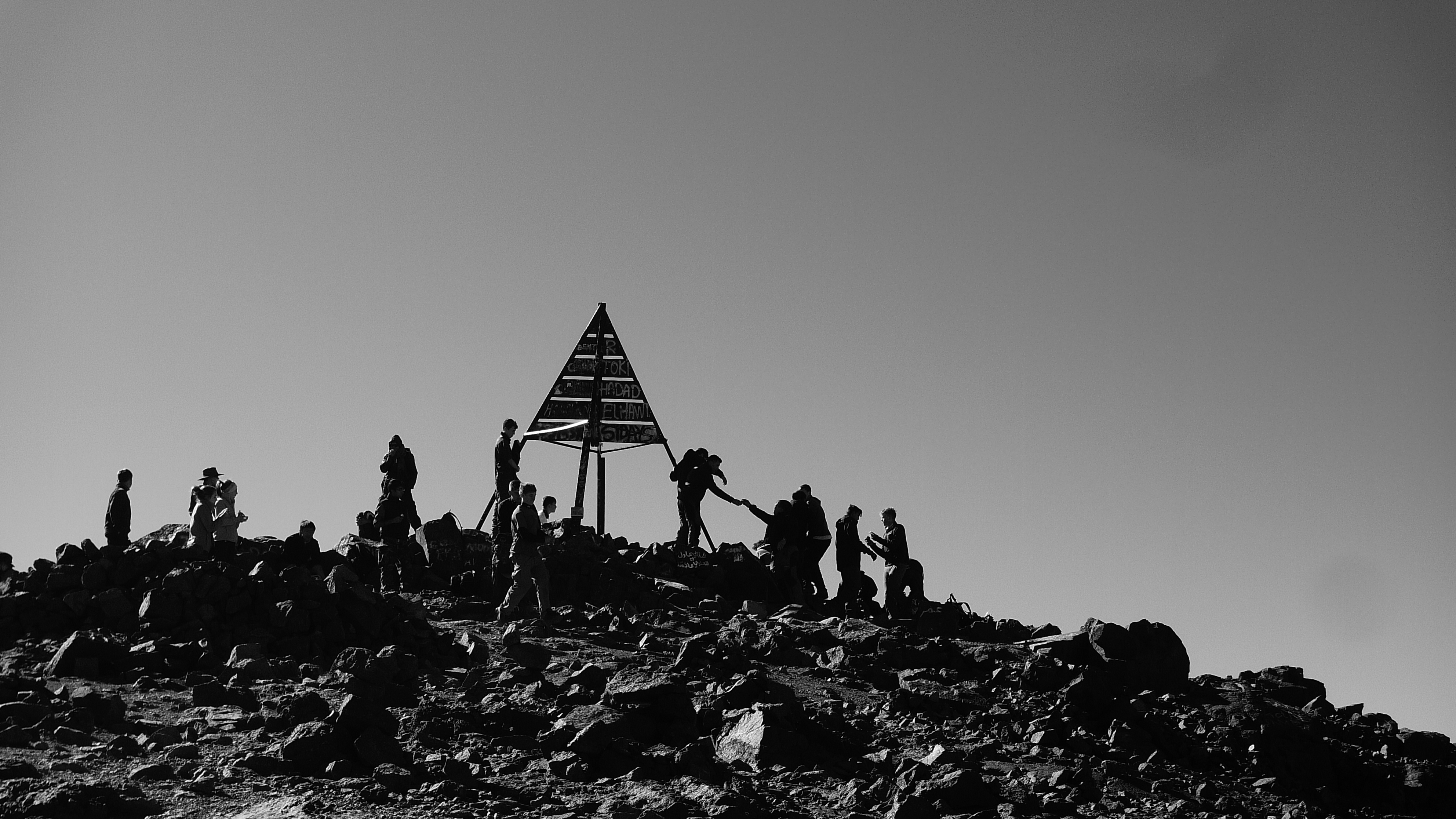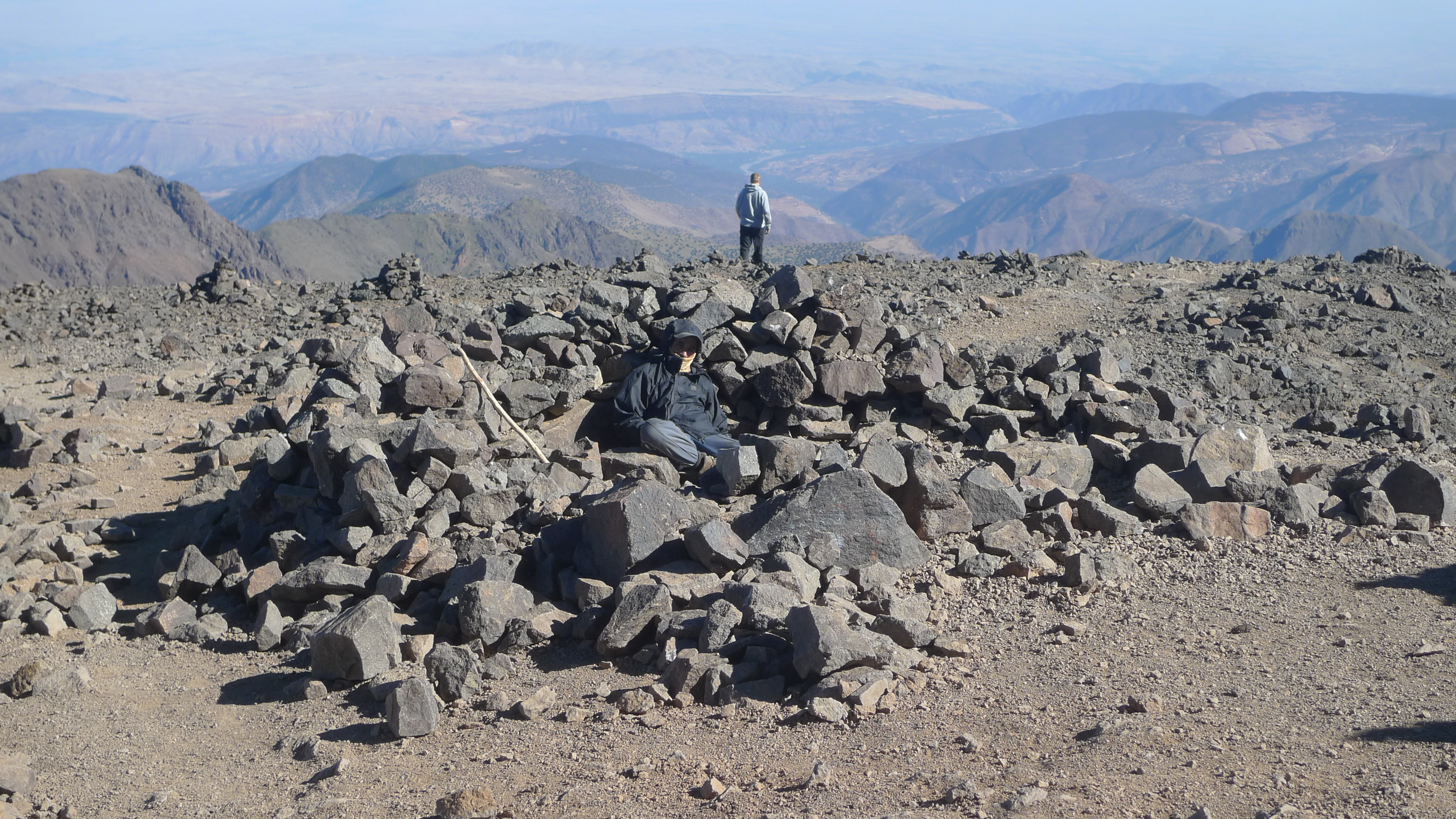 Auf 4167m ü. M. auf dem sommet du Toubkal, dem höchsten Berg Marokkos und des Hohen Atlas im Nordwesten Afrikas. Da er, obschon ziemlich steil, relativ leicht zu besteigen ist, tummeln sich hier zahlreiche Touristen.