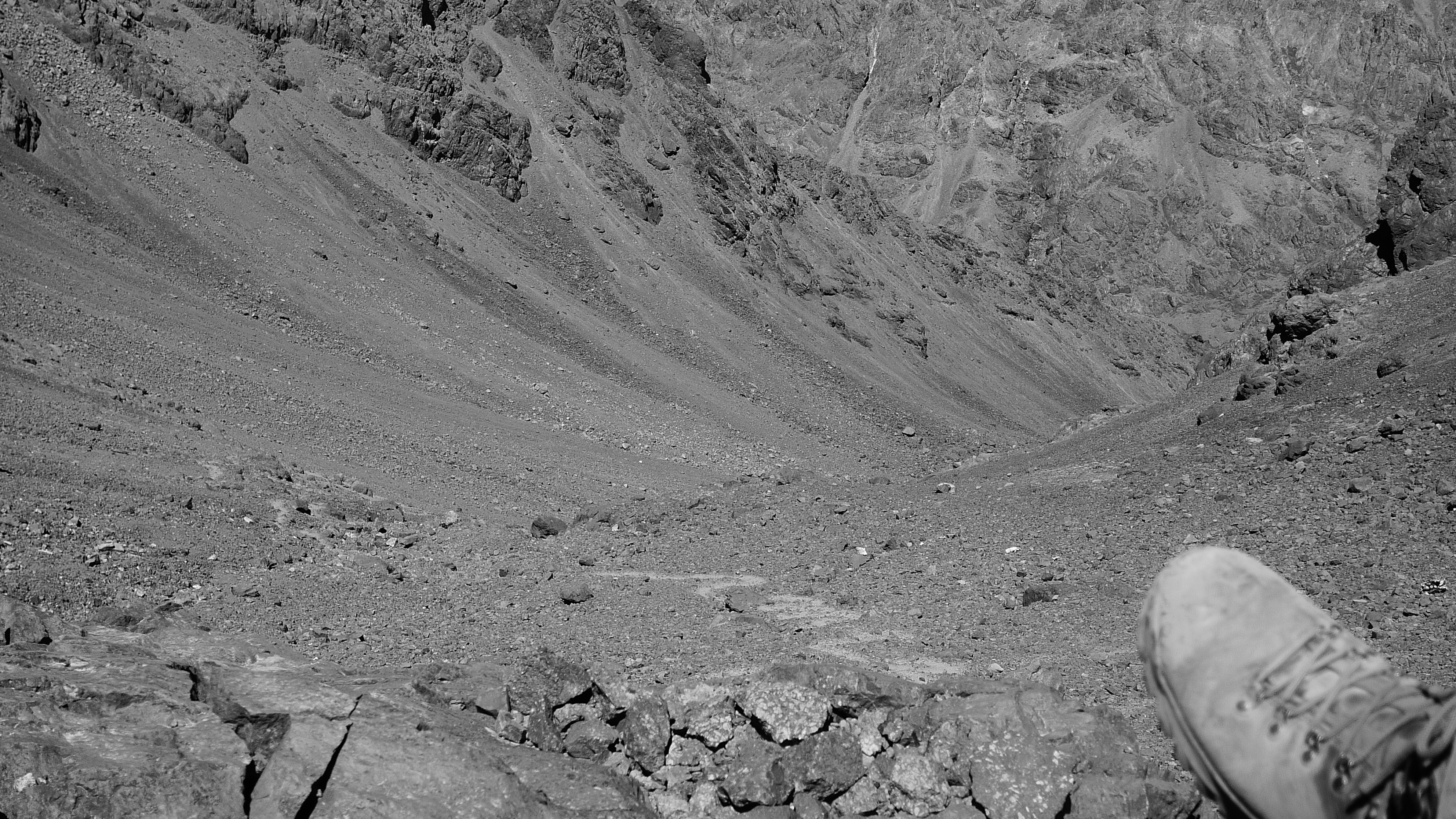Beim Abstieg wurde uns die Steile des Berges bewusst. Wir nahmen einen andern Weg als beim Aufstieg. Der sei in den ersten zwanzig Minuten zwar unangenehm, aber danach weniger steil als der andere. Unangenehm war er wirklich, und steil blieb er die ganzen drei Stunden lang. In einer Schutthalde fanden wir Flugzeugteile einer Maschine, die vor vierzig Jahren dort abgestürzt war.